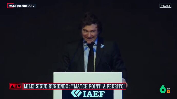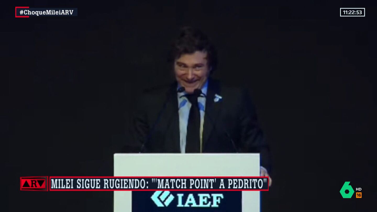 El presidente de Argentina, Javier Milei, ha dado a entender en un nuevo acto este miércoles que ha ganado su disputa al presidente del Gobierno de España, Pedro Sánchez, en el marco de la crisis diplomática desatada después de que el mandatario argentino llamase "corrupta" a Begoña Gómez, esposa de Sánchez. "Igual ya lo tengo en 'match point' a Pedrito, pese a lo que diga la progresía mediática", ha asegurado Milei durante una intervención en un acto del Instituto Argentino De Ejecutivos De Finanzas tras mencionar a España mientras hacía una comparación entre la actuación del personaje ficticio 'El Zorro' y el anarcocapitalismo.