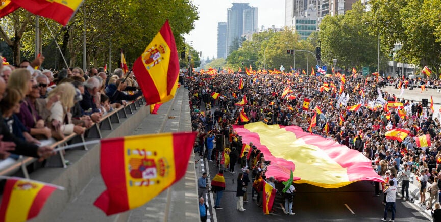 Miles de personas se manifiestan en contra del Gobierno y exigen a Sánchez elecciones, respaldadas por PP y Vox