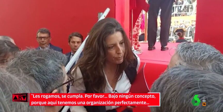 Las cámaras han captado como la responsable de Protocolo de la Comunidad de Madrid se impone de barrera física para impedir que el ministro suba las escaleras, a pesar de la insistencia de su jefe de Gabinete. "La representación de institucional está establecida. Le rogamos que se cumpla el protocolo", ha aseverado la responsable del protocolo del Gobierno de Ayuso después de situarse frente al ministro para evitar su ascenso. Antes que él ya habían subido, además de la presidenta madrileña, el líder del PP, Alberto Núñez Feijóo; el alcalde de la capital, José Luis Martínez-Almeida; y la ministra de Defensa, Margarita Robles.