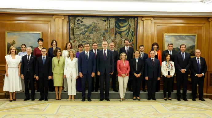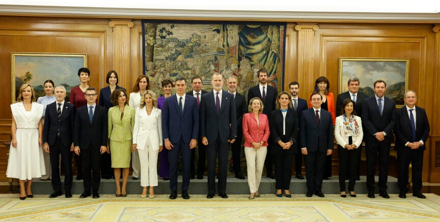 Las ministras y ministros del nuevo Gobierno de Pedro Sánchez han prometido en la mañana de este martes sus cargos para arrancar por fin la legislatura de la renovada coalición. Lo han hecho, como marca el protocolo y viene siendo habitual en este tipo de eventos, en el Palacio de la Zarzuela ante el rey Felipe VI, la presidenta del Congreso, Francina Armengol, y el propio líder del Ejecutivo, entre otros. El acto ha tenido lugar en una sala sin símbolos religiosos; solo, una mesa y la Constitución.