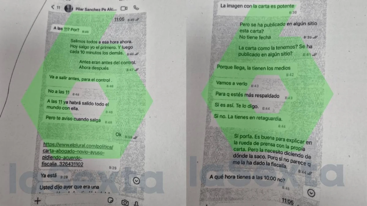 Su interlocutora era Pilar Sánchez Acera, jefa de gabinete del hoy ministro Óscar López, por entonces jefe de gabinete de Pedro Sánchez a su vez. En ese intercambio, Lobato le pregunta si el correo "se ha publicado en algún sitio". En él, recordemos, la defensa de González Amador reconocía los delitos fiscales y manifestaba la voluntad de su cliente de alcanzar un acuerdo. "¿La carta cómo la tenemos? ¿Se ha publicado en algún sitio?", le insiste.