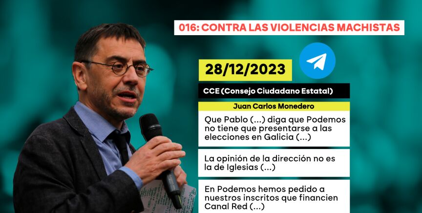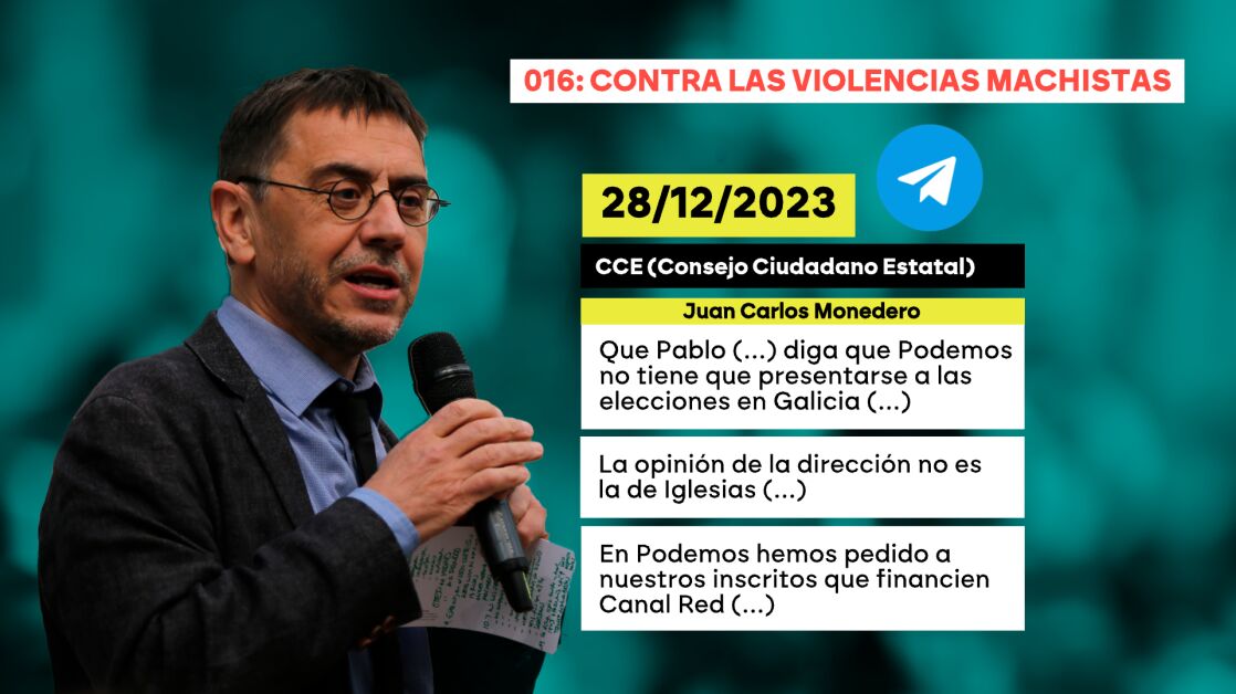 Monedero escribía en ese chat un 28 de diciembre de 2023: "Que Pablo (...) diga que Podemos no tiene que presentarse a las elecciones en Galicia y apostar por el BNG creo que ha sido desafortunado". Y es precisamente, según ese medio, por el tono de sus mensajes y las discrepancias con la dirección (no por las denuncias de acoso sexual) por lo que fue apartado de esos chats. Chats donde cargaba contra Pablo Iglesias.