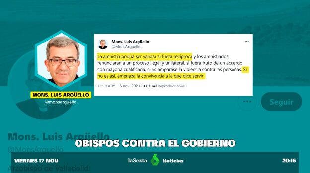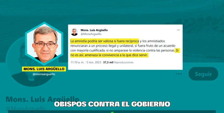 El arzobispo de Oviedo se pronunció hace unos días asegurando que el Gobierno estaba formado por "cómplices que venden lo ajeno por un plato de lentejas para seguir en el poder". El arzobispo de Valladolid también se pronunció en la misma línea: "La amnistía podría ser valiosa si fuera recíproca".