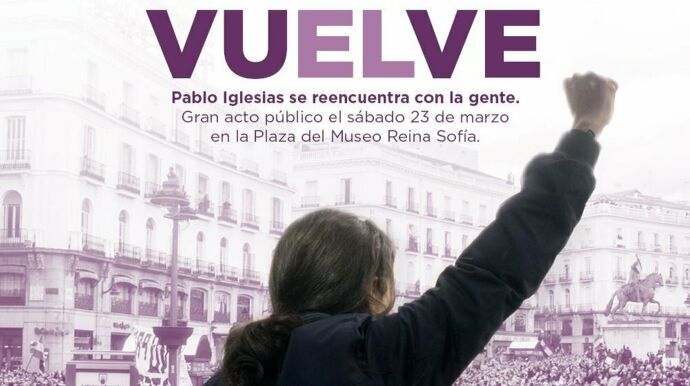 En el cartel se puede observar la imagen de Pablo Iglesiasjunto a la palabra "vuelve", con la sílaba "el" en referencia al artículo masculino destacada, tan solo dos días antes de la celebración de la huelga feminista del 8 de marzo.