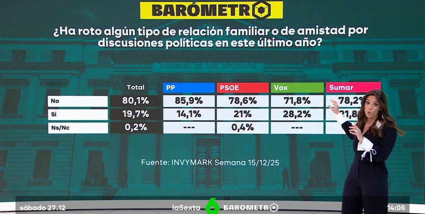 El dato La polarización en España es más evidente que nunca. Cerca de un 20% de los encuestados reconoce en el Barómetro de laSexta que 'sí', alguna vez ha roto relación con familiares o amigos por discusiones políticas en el último año.
