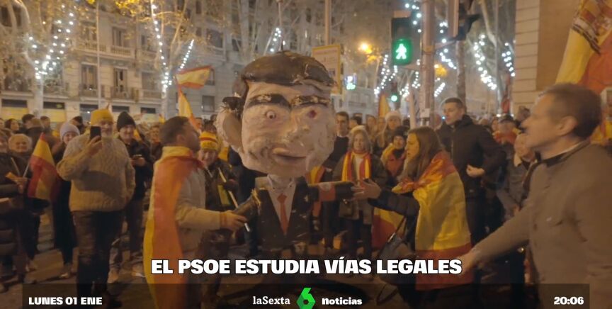 Según ha podido saber laSexta, la Fiscalía está esperando a que el PSOE ponga alguna denuncia o la Policía Nacional tome declaración a los organizadores de la protesta de Nochevieja en Ferraz para decidir si se abren diligencias por algún posible delito. Una de las posibilidades es que estos hechos se unan a la denuncia que presentó el PSOE por el resto de protestas en Ferraz y las palabras de Santiago Abascal en las que decía que Pedro Sánchez iba a acabar "colgado por los pies". En ese caso, se remitiría la denuncia ante la Fiscalía del Supremo por ser Sánchez aforado.