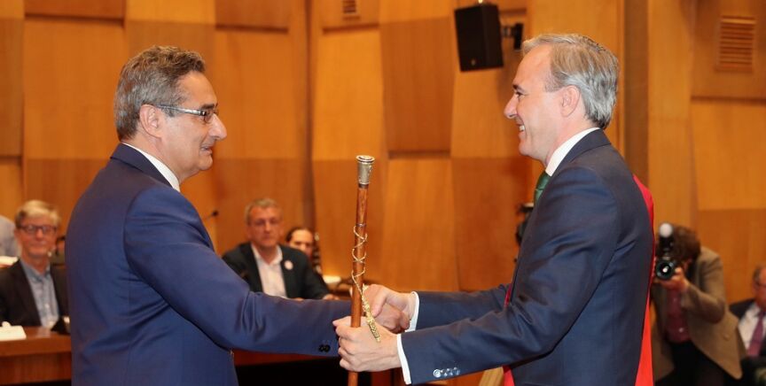 El nuevo Ayuntamiento de Zaragoza, recién constituido, ha investido alcalde al popular Jorge Azcón, gracias a los ocho concejales de su grupo, los seis de Ciudadanos y los dos de Vox, que suman una mayoría alternativa al de la lista más votada, la del PSOE de Pilar Alegría, que cuenta con diez concejales.
