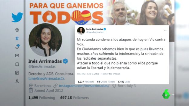 También la líder de Ciudadanos ha censurado este suceso y ha asegurado, como lo ha hecho Casado, que su formación lleva años sufriendo la "intolerancia de los radicales separatistas". Así se ha expresado en Twitter la presidenta de la formación naranja: "Atacan a todo el que no piensa como ellos porque odian la libertad y la democracia". Desde el PSC también han condenado la violencia y han pedido que vuelva la Cataluña del diálogo.