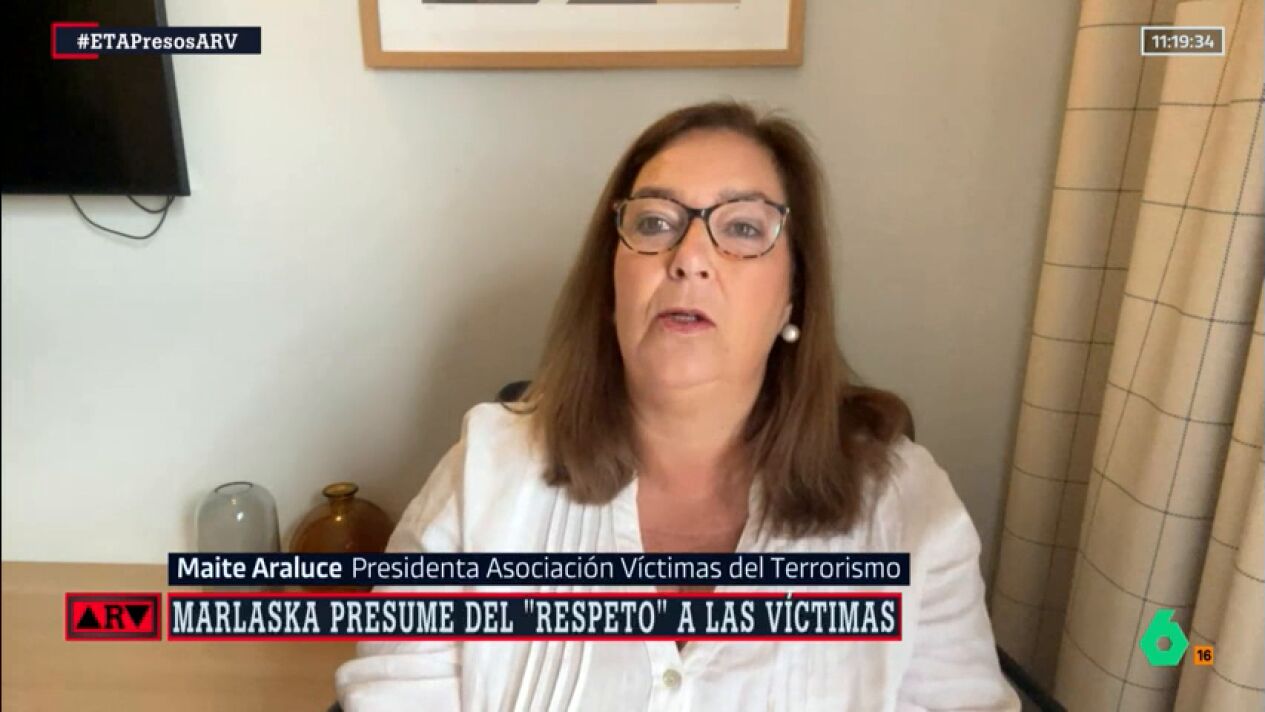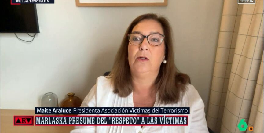 La presidenta de la AVT relata cómo se produjo el momento en el que negó el saludo a Marlaska: "El ministro vino hacia mí y me dijo: 'Maite, dame un beso'". "No, estoy harta, ya está bien de mentirnos y de tomarnos el pelo", explica Maite Araluce que le contestó al responsable de Interior.