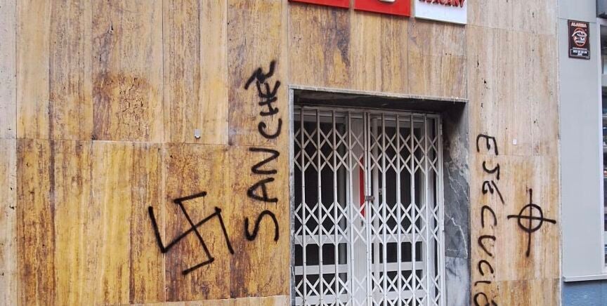 El PSOE ha denunciado este domingo lo que califica como "un serio ataque de odio" contra su sede de Alicante, que ha aparecido vandalizada con pintadas fascistas -entre ellas una esvástica- y un mensaje amenazante dirigido al presidente del Gobierno: "Sánchez ejecución". Una acción que los socialistas atribuyen a un "clima de odio y crispación" del que culpan a la derecha y la ultraderecha.