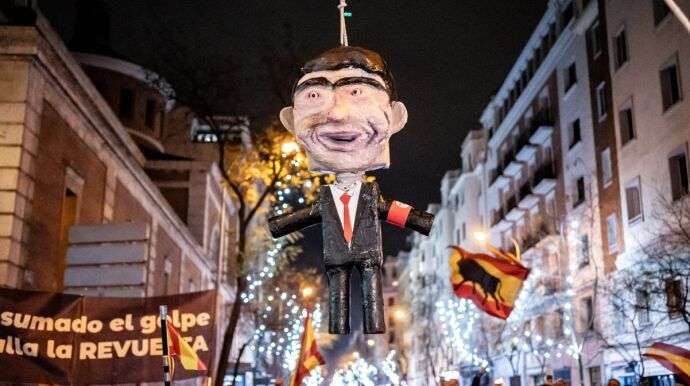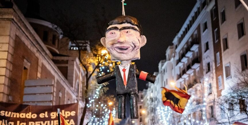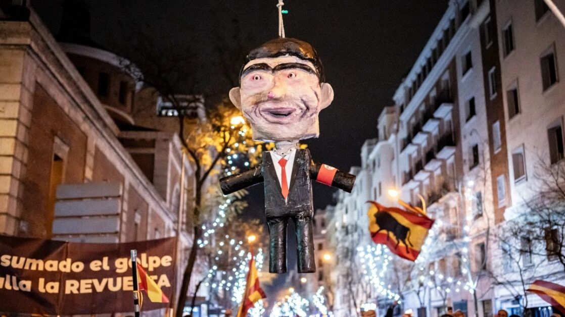 El Partido Socialista asegura que el apaleamiento de un muñeco de Pedro Sánchez en plena protesta en la calle Ferraz durante la Nochevieja fue un acto violento y cargado de odio que no debería repetirse, y además exige al PP que lo condene.