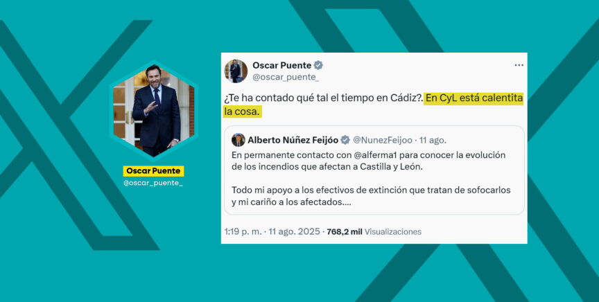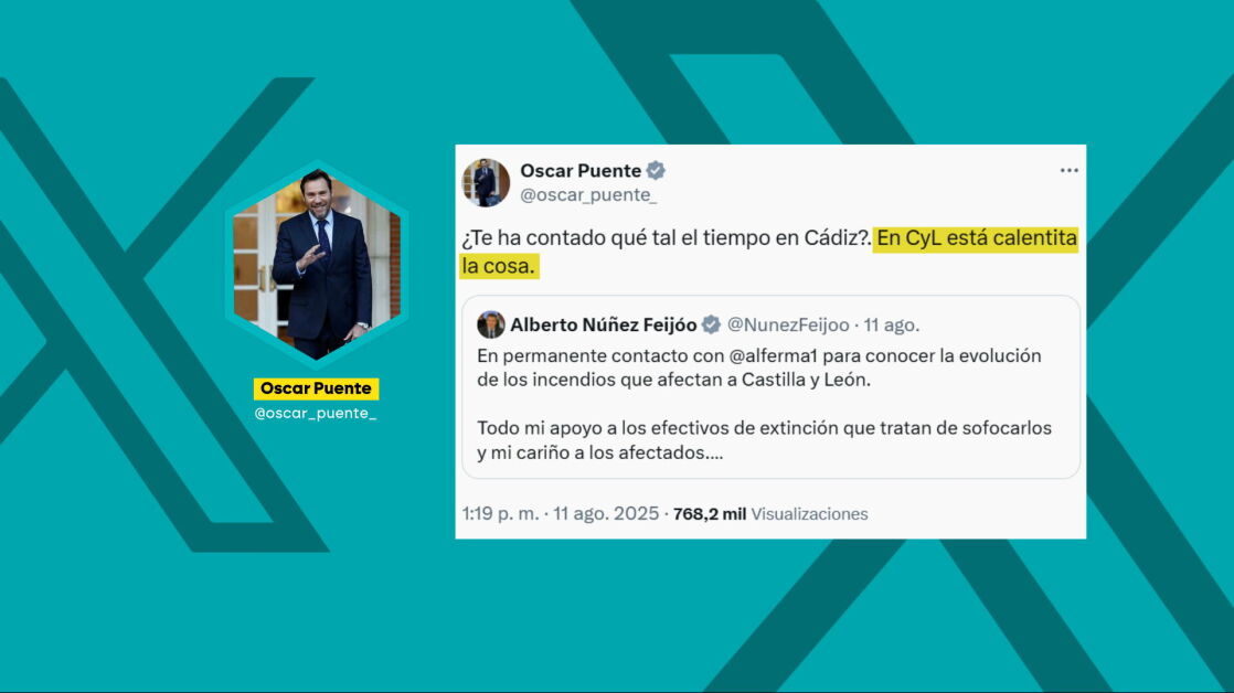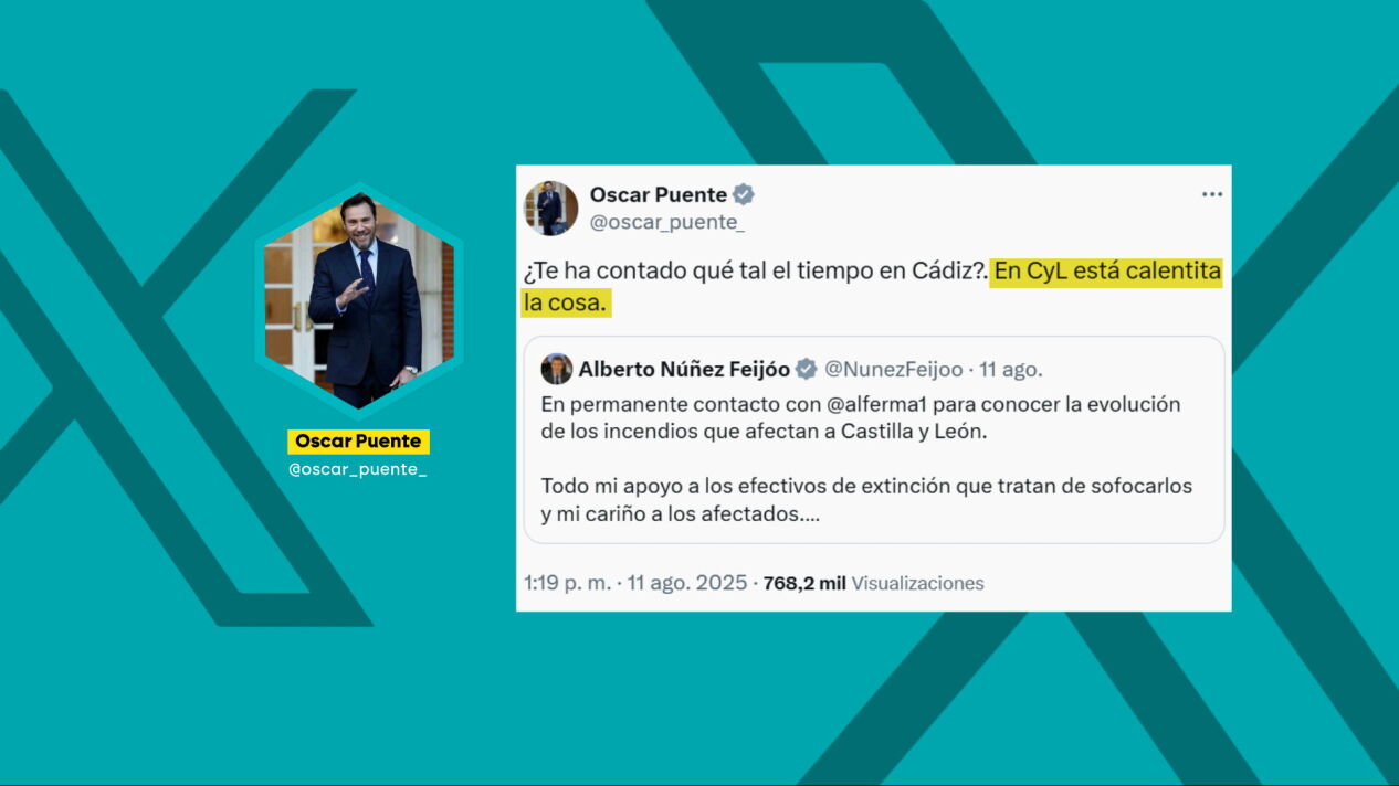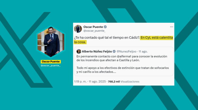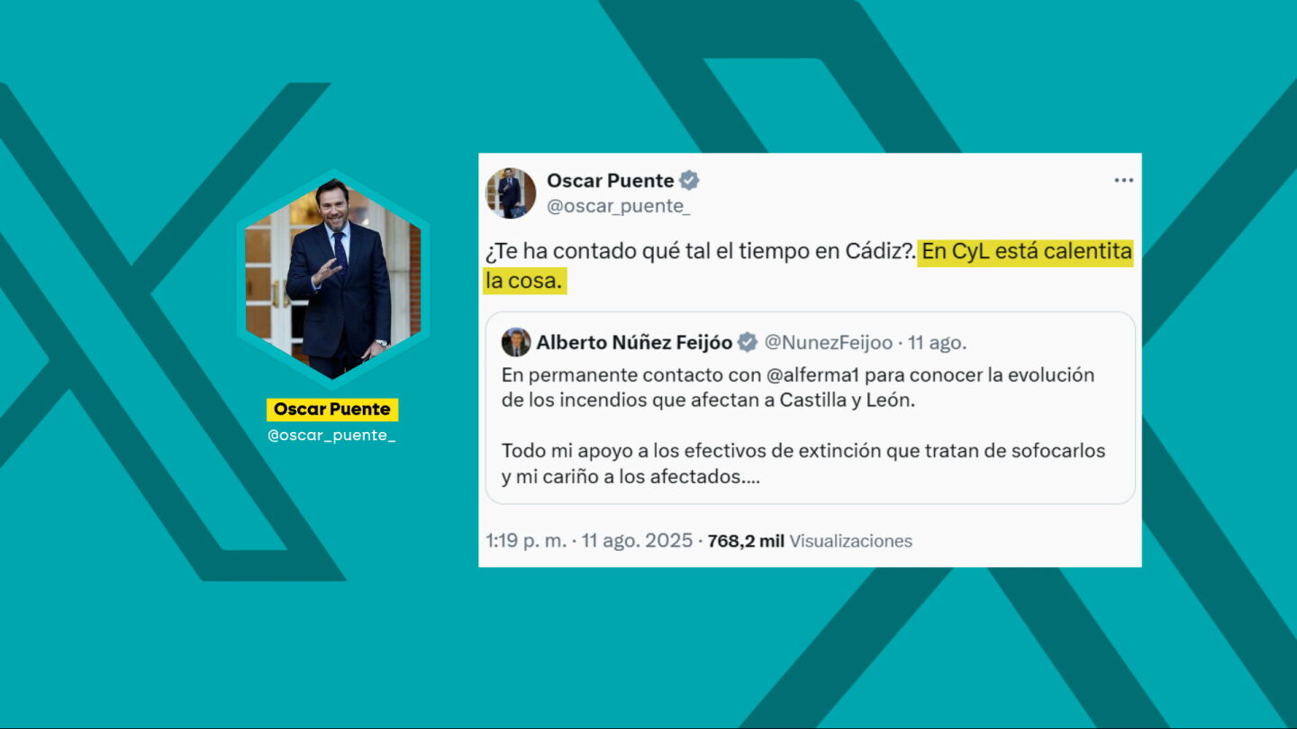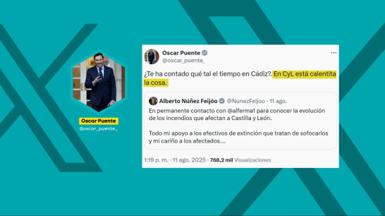 Posteriormente, respondía a un mensaje del líder del PP, Alberto Núñez Feijóo, preguntándole si Mañueco le había contado "qué tal el tiempo en Cádiz" y avisándole que en Castilla y León "está calentita la cosa". Esta última publicación del ministro desataba la reacción de los 'populares', que a través de su diputado Jaime de Olano han acusado a Puente de "cachondearse" de los incendios afeando que "el sanchismo es un estercolero ético".