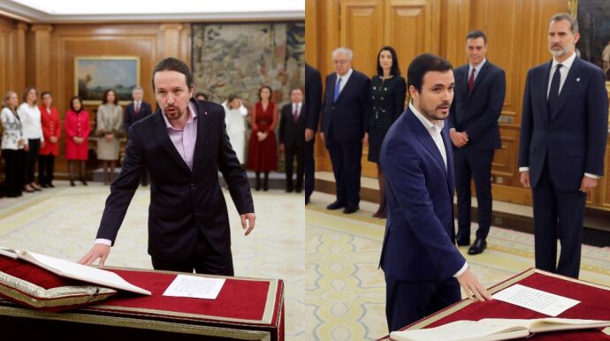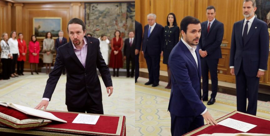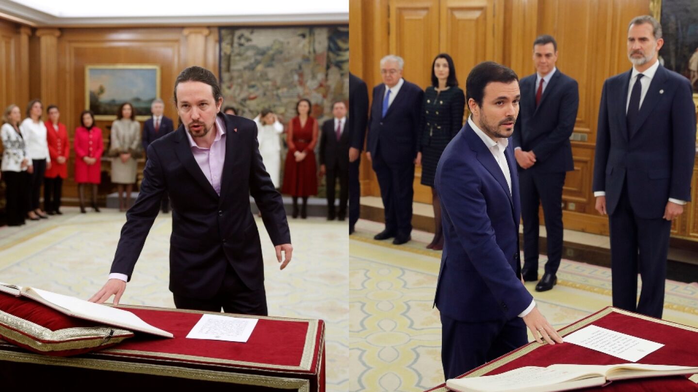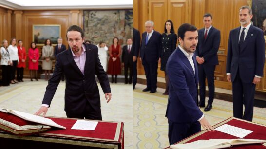Durante esta ceremonia, ambos dirigentes de Unidas Podemos han prometido su cargo -al igual que el resto de ministros de la formación morada- siguiendo la fórmula protocolaria, prometiendo lealtad al rey, aunque han incorporado al final la fórmula inclusiva "Consejo de Ministras y Ministros".