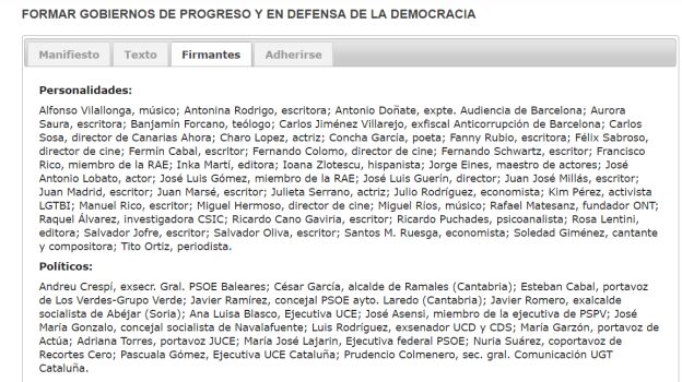 Entrelos firmantes hay diversos intelectuales y artistas como el cantante Miguel Ríos, el escritor Juan José Millás o la actriz Charo López.