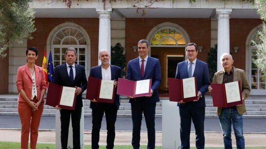 Una veintena de reuniones, "cientos de llamadas" y "horas de negociación y diálogo". La reforma del sistema de pensiones ya es una realidad a espera de que sea ratificada en el Congreso de los Diputados. Fue anunciada a finales del mes de julio por el presidente del Gobierno, Pedro Sánchez, en su balance semestral. Sin embargo, ha sido este miércoles cuando se ha llevado a cabo su firma oficial en la que han participado desde Moncloa los agentes sociales que han permitido alcanzar este acuerdo que para Sánchez es "producto de la buena política".