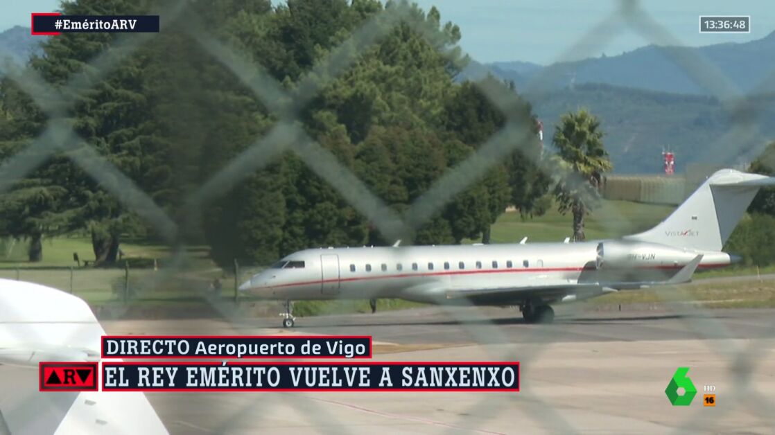 El rey emérito ya está de nuevo en Galicia. El emérito ha aterrizado en el aeropuerto de Vigo sobre las 13:40 horas y se espera que sea su amigo Pedro Campos el que le recoja en el aeropuerto para viajar hasta Sanxenxo, donde permanecerá hasta finales de semana.