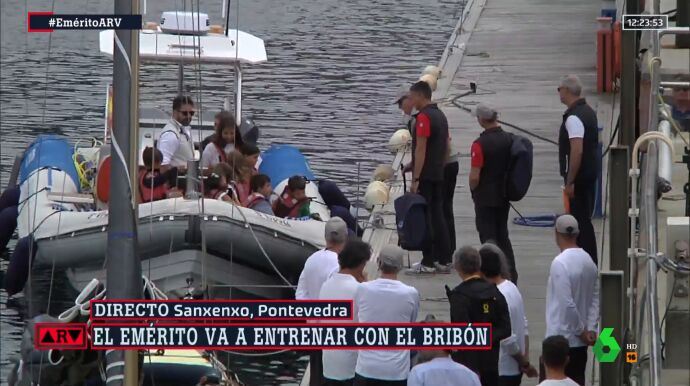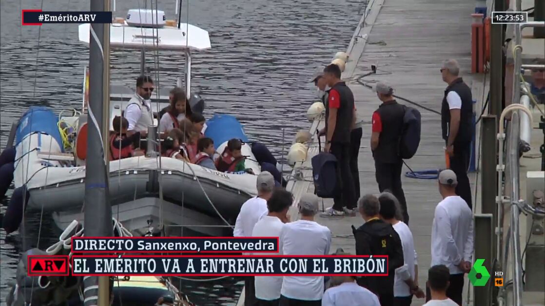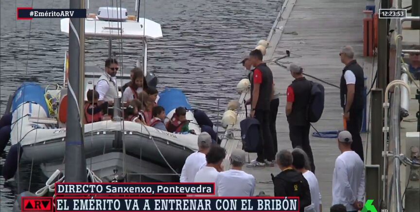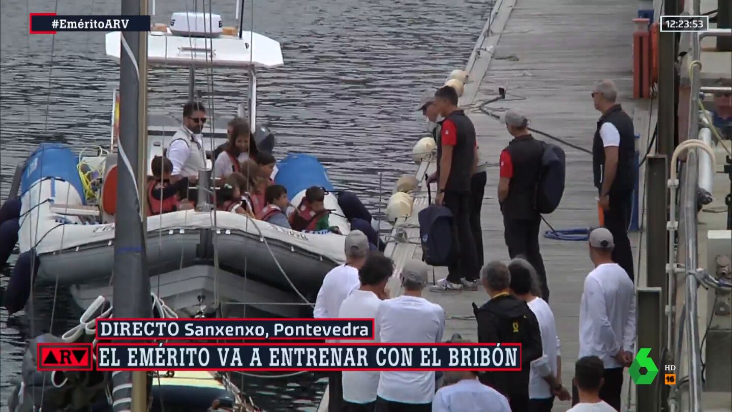 El rey Juan Carlos se ha desplazado al Real Club Náutico de Sanxenxo, desde la residencia de su amigo y anfitrión Pedro Campos, para preparar la regata en la que pretende participar este fin de semana en la localidad pontevedresa. Tras bajarse del coche, el rey emérito ha caminado con la ayuda de dos escoltas que le han acompañado a la embarcación, no sin antes saludar a un barco repleto de niños que esperaba a partir a la llegada del rey.