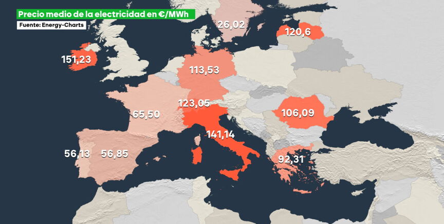 Como consecuencia, en España, donde el precio por megavatio hora está cerca de los 57 euros, se está pagando casi tres veces menos que en países como Alemania, Italia o Irlanda, con precios de 113, 141 y 151 euros por megavatio hora, respectivamente.