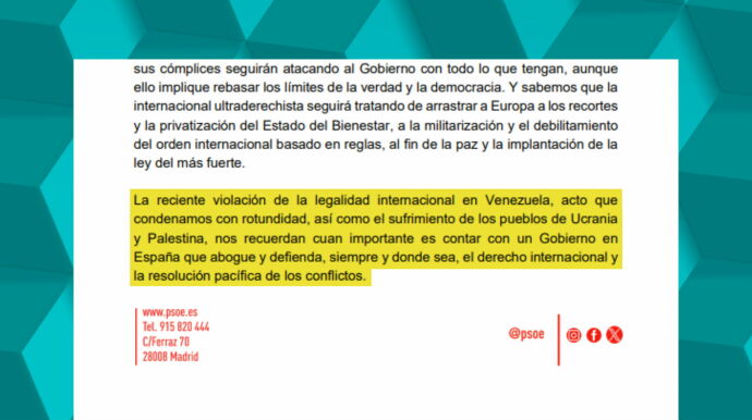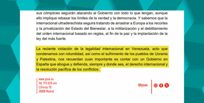 "La reciente violación de la legalidad internacional en Venezuela, acto que condenamos con rotundidad, así como el sufrimiento de los pueblos de Ucrania y Palestina, nos recuerdan cuán importante es contar con un Gobierno en España que abogue y defienda, siempre y donde sea, el derecho internacional y la resolución pacífica de los conflictos", ha esgrimado.