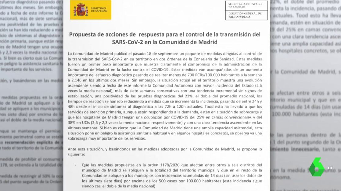 Posteriormente y una vez han salido a la luz los documentos, fuentes de la Comunidad de Madrid han reconocido a laSexta que el jueves por la tarde se mostró "el cambio de criterio por parte del Ministerio de Sanidad" por el que se recomendaba aplicar medidas restrictivas a áreas con incidencia del virus de 500/100.000 habitantes y el confinamiento de la ciudad de Madrid.