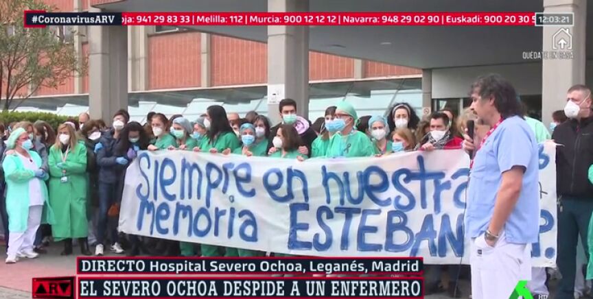 El Hospital Severo Ochoa de Leganés ha rendido este lunes homenaje a Esteban, el enfermero de la UCI de 57 años fallecido el viernes pasado por coronavirusen este centro hospitalario.