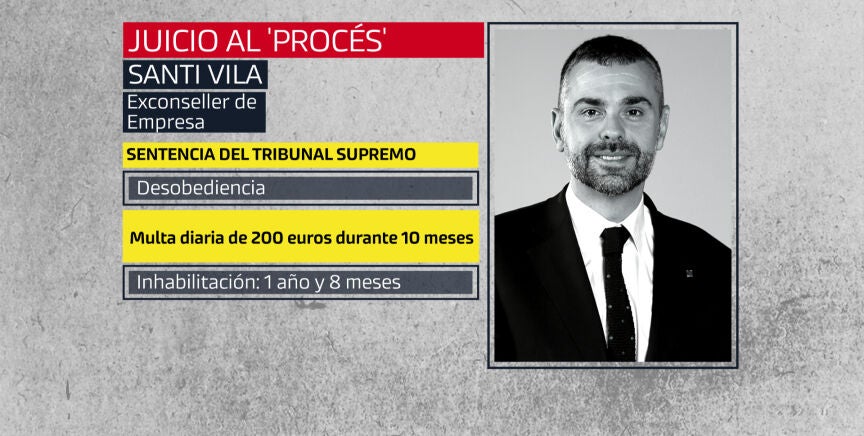 Santi Vila, en libertad condicional bajo fianza de 50.000 euros, ha sido condenado por el Tribunal Supremo a un año y ocho meses de inhabilitación por un delito de desobediencia en el marco de la organización del referéndum ilegal del 1-O de 2017 y la declaración unilateral de independencia de Cataluña. Además, tendrá que hacer frente a una multa de diez meses con una cuota diaria de 200 euros, que suman un total de 60.000 euros.