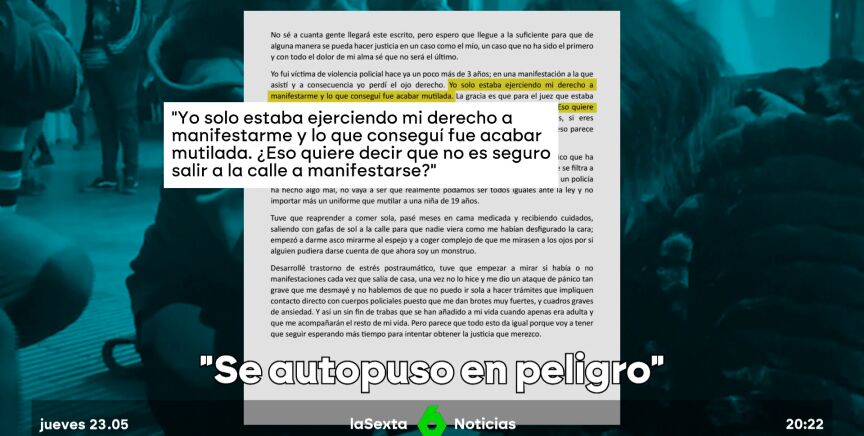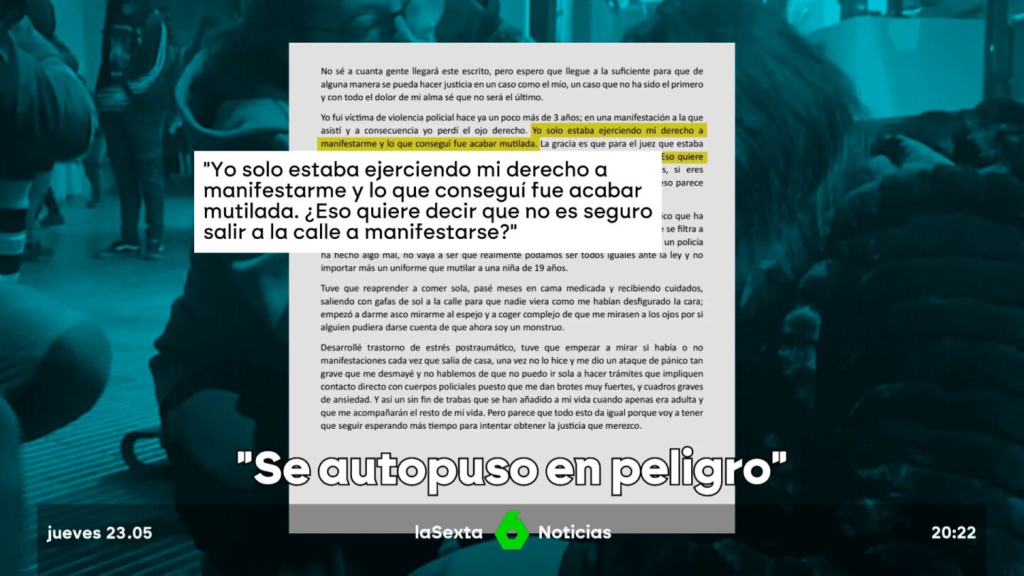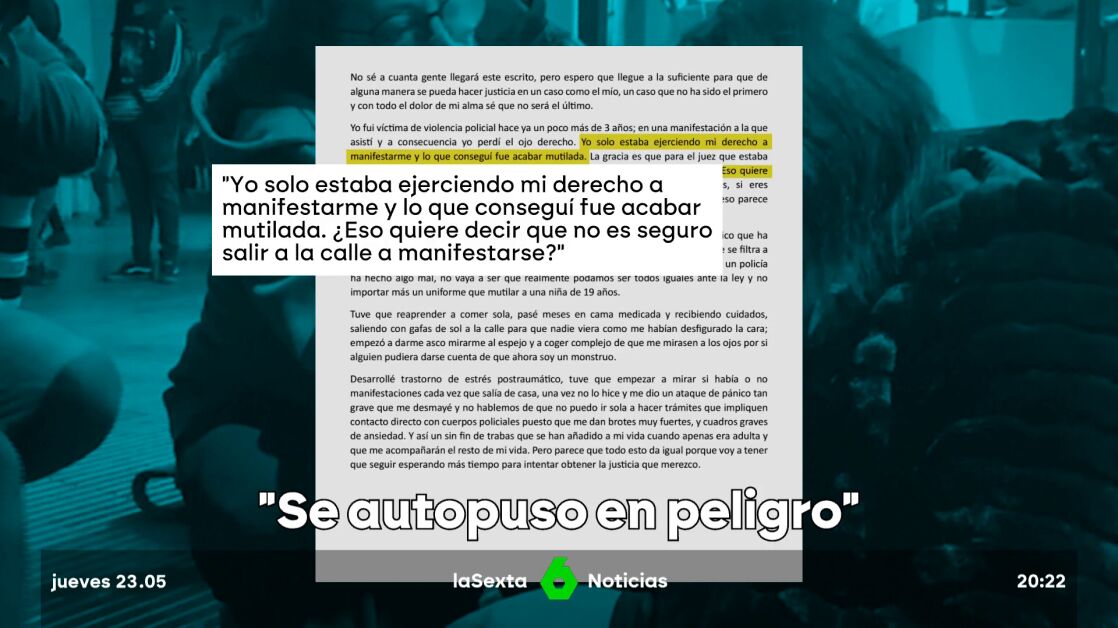 Y ahora el juez que estaba investigando lo ocurrido la culpa a ella. Dice que se autocolocó. Se autopuso en peligro. Recibió un disparo de los mossos, una pelota de goma contra su cara que la dejó sin ojo mientras se manifestaba por Pablo Hasel. "Yo solo estaba ejerciendo mi derecho a manifestarme y lo que conseguí fue acabar mutilada. ¿Eso quiere decir que no es seguro salir a la calle a manifestarse?".