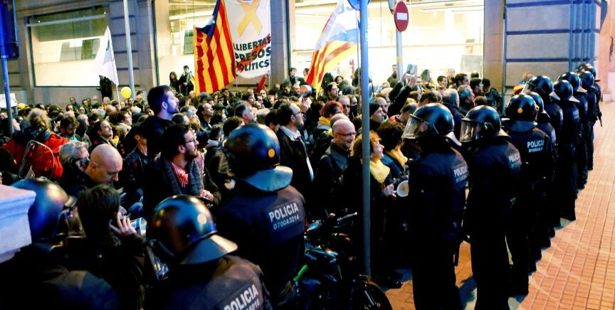 Los centenares de independentistas que todavía se manifiestan convocados por los denominados "comités de defensa de la república" cantan consignas como "No tenemos miedo", "Fuera las fuerzas de ocupación" y "Somos república", además de hacer ruidos con silbatos y cacerolas.