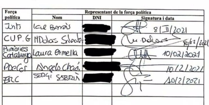 Han estampado su firma en el documento la candidata de JxCat a la presidencia de la Generalitat, Laura Borràs, la cabeza de lista de la CUP, Dolors Sabater, la número uno del PDeCAT en las elecciones del 14F, Àngels Chacón, así como el hasta ahora presidente del grupo parlamentario de ERC, Sergi Sabrià, el único de los firmantes que no se presenta como presidenciable en los comicios de este domingo.
