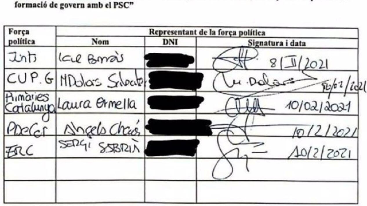 "Las formaciones que firman este documento se comprometen a que, sea cual sea la correlación de fuerzas surgida de las urnas, en ningún caso se pactará la formación de gobierno con el PSC", dice el texto, firmado por JxCat, ERC, la CUP, el PDeCAT y Primàries y que Catalans per la Independència ha difundido a través de Twitter.