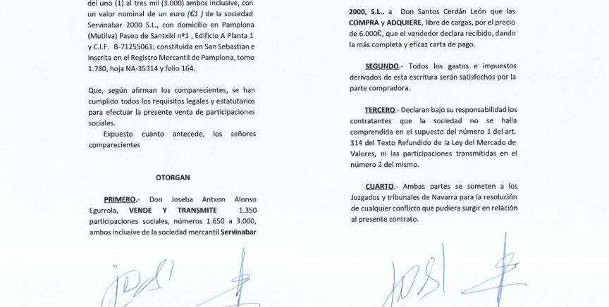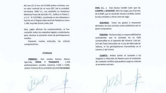 En el documento, al que ha tenido acceso laSexta, se recoge cómo el ex secretario de Organización del PSOE paga 6.000 euros, por 1.350 de las 3.000 participaciones que tiene la empresa, un 45% del total. En la escritura dice: "Ambas partes se someten a los juzgados y tribunales de Navarra para la resolución de cualquier conflicto que pudiera surgir en relación al presente contrato".