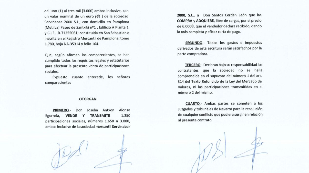 Lo mismo, negar la evidencia, hizo la empresa navarra al mandar un comunicado que rezaba: "Santos Cerdán no ha sido nunca, ni es socio de Servinabar S.L. No existe ninguna escritura en la que el Sr. Cerdán haya adquirido participaciones sociales de la empresa". El documento, sí que existe.