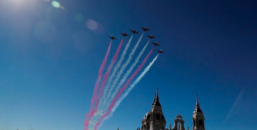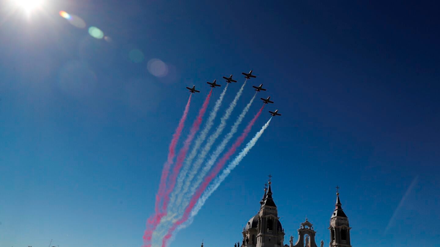 Como cada año, siete aviones del grupo de vuelo acrobático del Ejército han dibujado la bandera de España en el cielo madrileño como homenaje a aquellos militares fallecidos en acto de servicio.