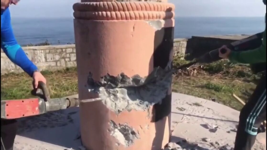 Un grupo de personas derriba con una radial un monumento franquista de Ondarroa