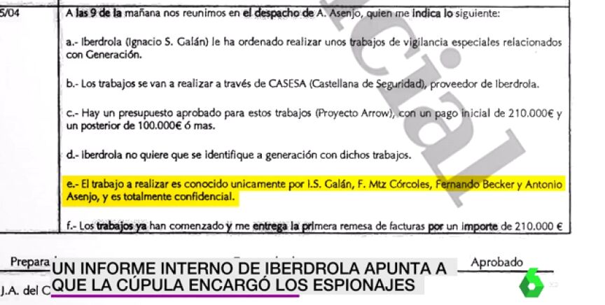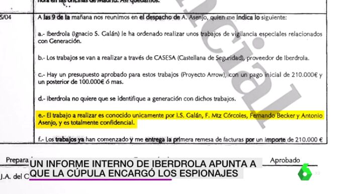 Un informe interno de la empresa Iberdrola apunta a que la cúpula de la compañía podría conocer la contratación de Villarejo. En el documento, que publica 'El Confidencial', el antiguo jefe de seguridad de la compañía, Antonio Asenjo, asegura que el propio presidente de Iberdrola, Sánchez Galán, le ordenó tareas de vigilancia y espionaje.
