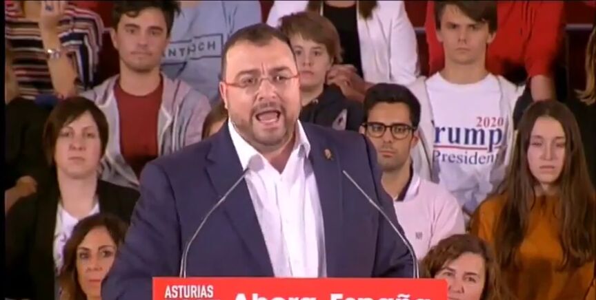 El joven deja al descubierto una camiseta en la que se lee "Trump President 2020". En ese momento el auditorio aplaude unánimemente al presidente asturiano por algo dicho durante el mitin, pero el joven protagonista de esta noticia permanece impávido, serio, mirando al frente y mostrando su polémica camiseta.