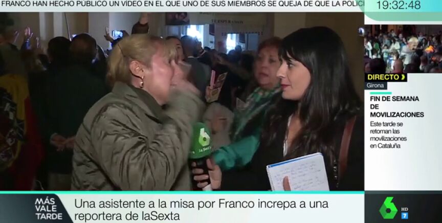 A pleno grito, acusó a Jaenes y a la cadena de "faltarle el respeto a Franco todos los días". Cuando la periodista le respondió que estaba en pleno directo y trabajando, la mujer añadió: "No trabajáis, porque si trabajarais iríais a Cataluña. Tenéis narices de meteros con un muerto, pero meteros con Cataluña".