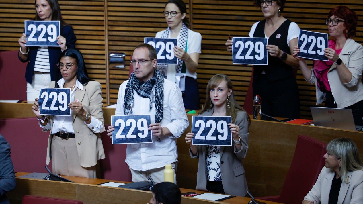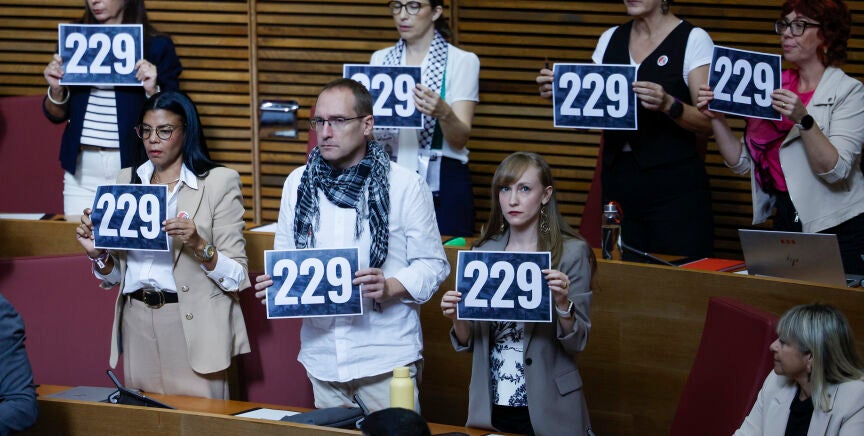 Acto seguido, los diputados del PSPV se han levantado y han abandonado el hemiciclo, algo que han hecho unos instantes más tarde los representantes de Compromís. Ante esa situación y las protestas de las víctimas por los pasillos, la presidenta de Les Corts, Llanos Massó, ha suspendido la sesión.
