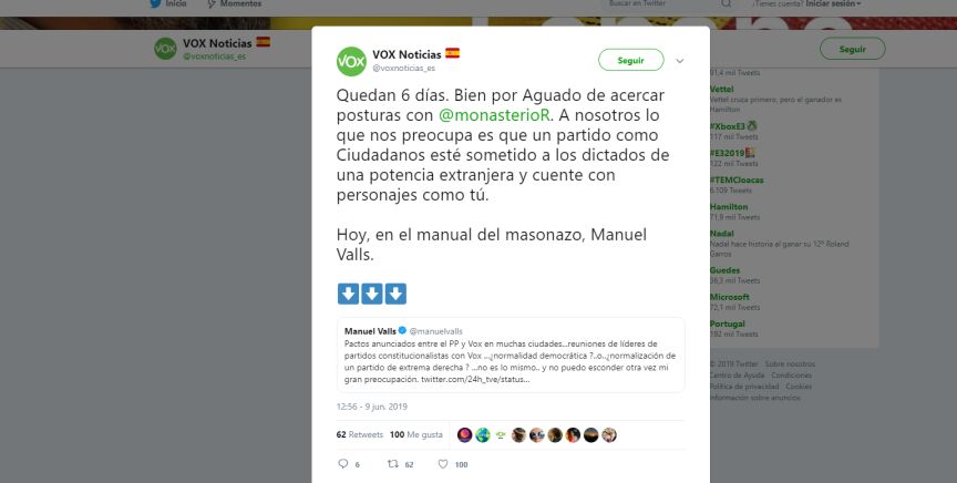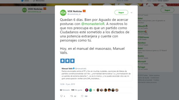 Por su parte, Vox ha respondido a Valls con un duro mensaje en Twitter: "Quedan seis días. Bien por Aguado de acercar posturas con Monasterio. A nosotros lo que nos preocupa es que un partido como Ciudadanos esté sometido a los dictados de una potencia extranjera y cuente con personajes como tú. Hoy, en el manual del masonazo, Manuel Valls".