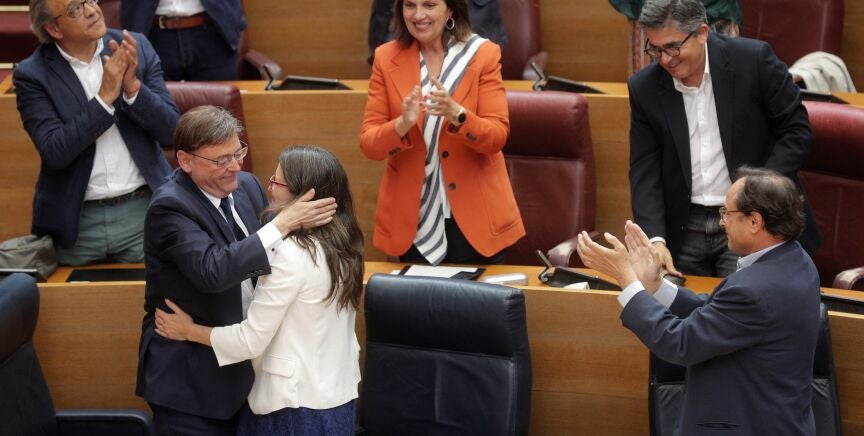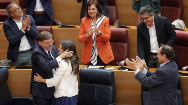 Puig, que se convirtió en el sexto presidente valenciano el 25 de junio de 2015, se ha abrazado con Mónica Oltra en su escaño ante los aplausos de la bancada en pie del Botànic, a los que ha correspondido.