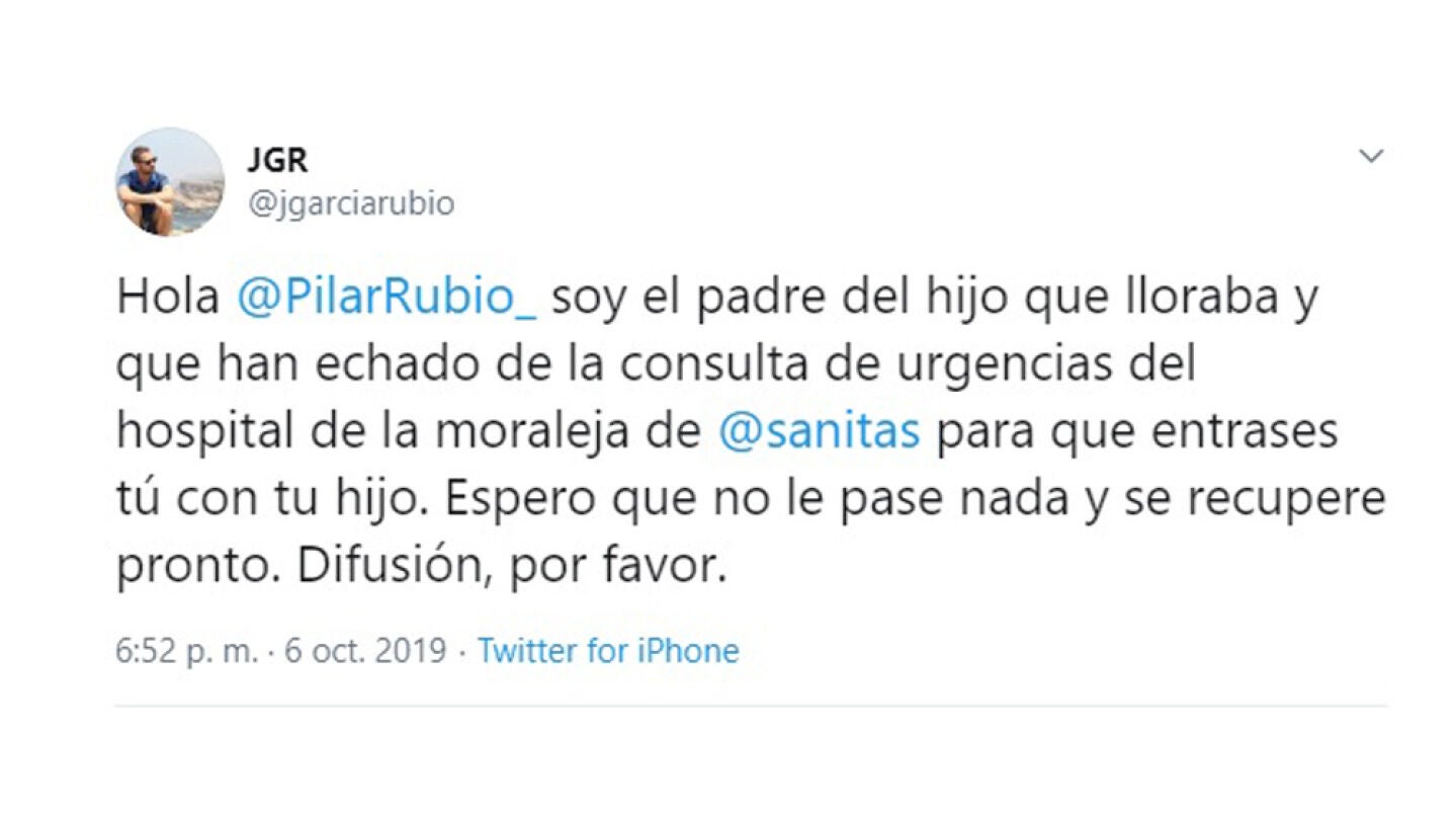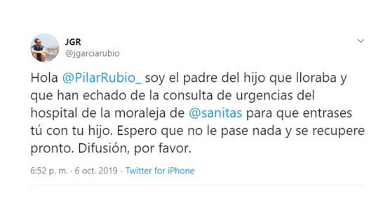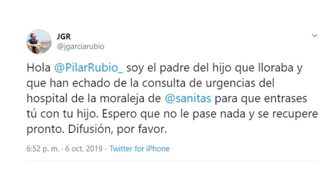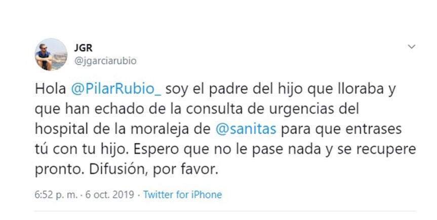 Tras lo que ellos consideran una injusticia, tanto Jorge como su mujer decidieron hacerla pública en Twitter, que se hizo viral a los pocos segundos. "Hola Pilar Rubio, soy el padre del hijo que lloraba y que han echado de la consulta de urgencias del Hospital de La Moraleja de Sanitas para que entrases tú con tu hijo. Espero que no le pase nada y se recupere pronto. Difusión, por favor", señalaGarcía en su tuit.