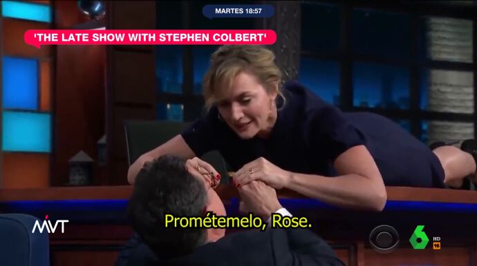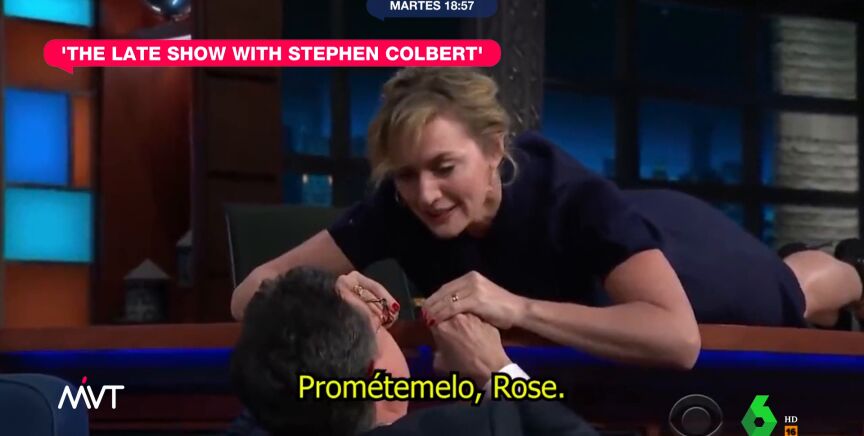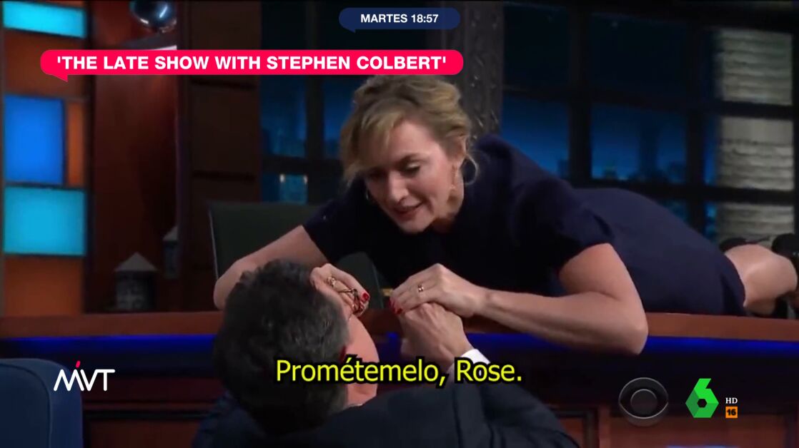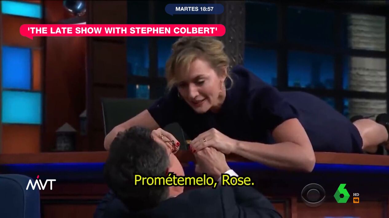 Kate Winslet ha visitado el programa 'The Late Show' para promocionar Avatar 2, película en la que da vida a Ronal, una de las na'vi del agua; y su presentador Stephen Colbert le ha hecho unas preguntas que han enviado los fans sobre Titanic, como si el dibujo de ella desnuda lo hizo de verdad Leonardo DiCaprio o por qué mintió a Jack en el último momento y le dejó hundirse: "Debió intentar más duramente el subirse a aquella puerta", espeta ella haciendo alarde de su humor, para acto seguido proponer al presentador recrear la mítica escena en directo, ya que la mesa tiene unas medidas muy similares a las de la puerta que se utilizó en el rodaje.
