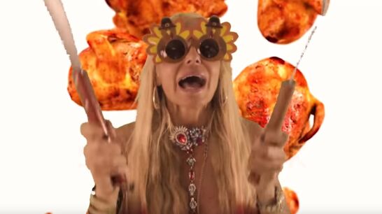 En el videoclip, la presentadora lleva diferentes bikinis e incluso un disfraz de Donald Trump, y baila con un cuchillo y un tenedor. "Todos a cacarear y a mover las alitas", anima la artista.