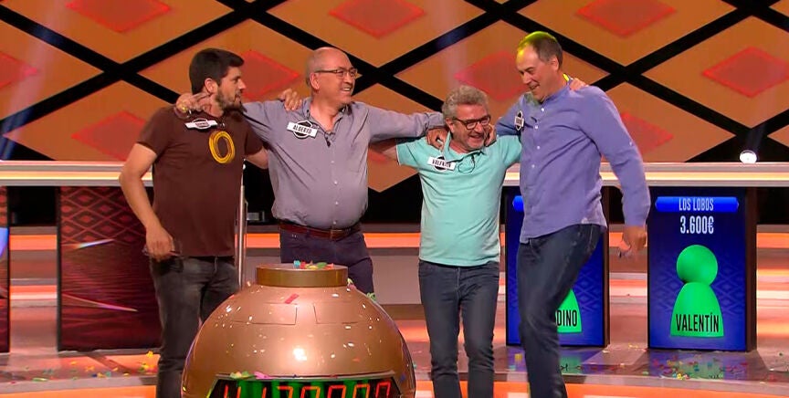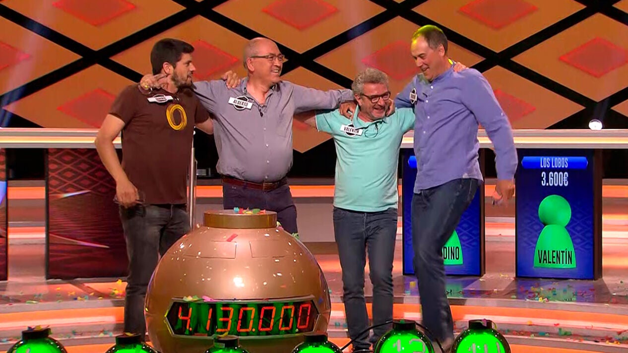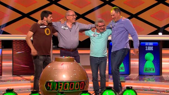 Alberto, Valentín, Erundino y Manu se llevan al fin el mayor premio jamás ganado en un concurso de televisión. 505 programas y dos años han necesitado 'Los Lobos' para llevarse los 4.130.000 de euros en la bomba final de 'Boom', que se unen a los 2,5 millones que ya habían acumulado.
