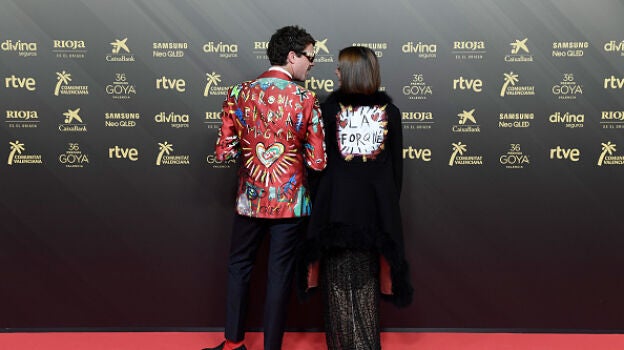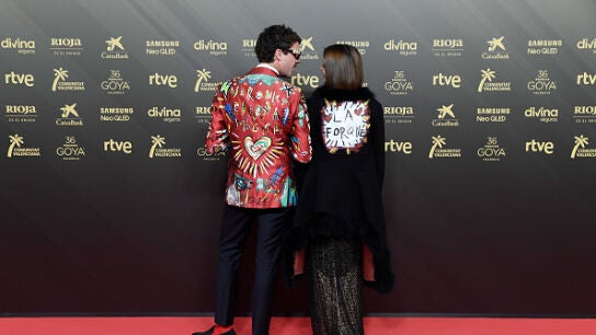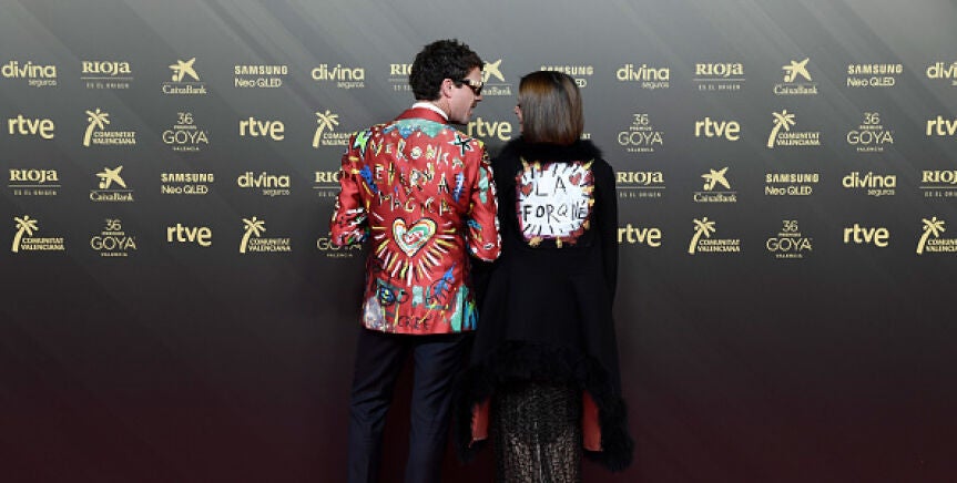 Sin duda, uno de los looks más llamativos es el de la pareja formada por Macarena Gómez y Aldo Gómez, quienes han explicado que la ropa que llevan esta noche es en homenaje a su querida amiga Verónica Forqué, que falleció a principios de año. Como se puede ver en la imagen, ambos llevan en su espalda el nombre de su amiga con corazones alrededor.