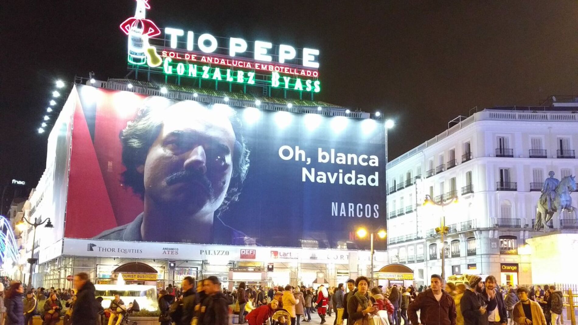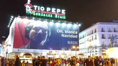 El cartel publicitario de la serie 'Narcos' con el eslogan "Oh, blanca Navidad" colgado en la Puerta del Sol madrileña, bajo el letrero de Tío Pepe, ha generado una fuerte división entre los ciudadanos madrileños.