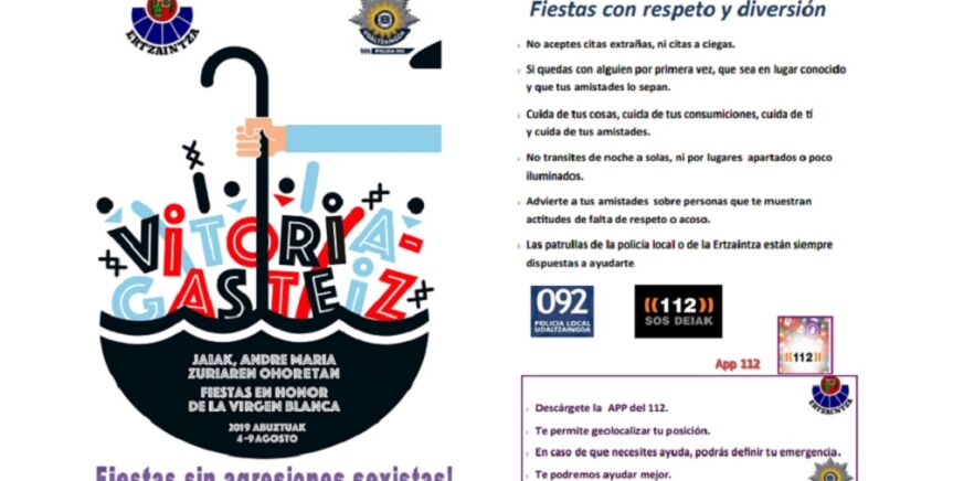 En concreto, la policía vasca y la local de Vitoria han editado tres folletos, uno de los cuales tiene consejos de prevención para evitar agresiones sexistas, y otros dos que pretenden evitar robos en domicilio y hurtos, y que se difundirán durante las fiestas de La Blanca de la capital alavesa.