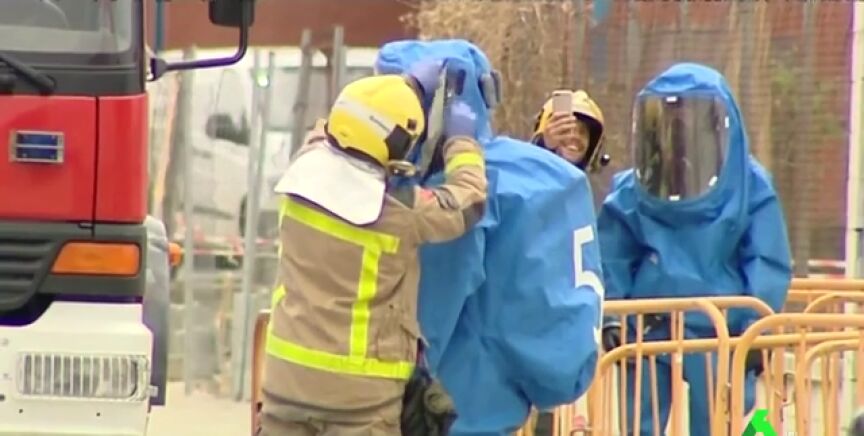 Salen de la zona, brazos arriba y con una manguera desinfectan los trajes. Son los últimos pasos de los bomberos después de activar el protocolo de emergencias químicas en Molins de Rei, en Barcelona.