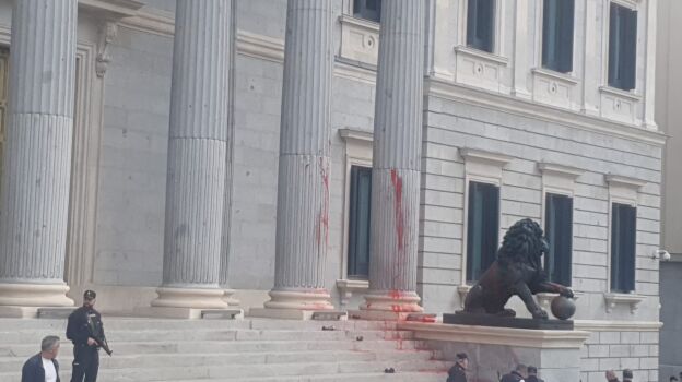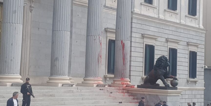 Un grupo de activistas climáticos, de los grupos Rebelión Científica y Futuro Vegetal, han lanzado pintura en la puerta principal del Congreso de los Diputados.