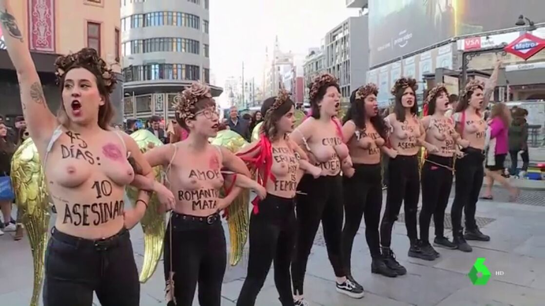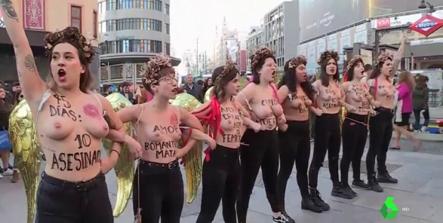 Numerosas activistas de Femen se han manifestado en la céntrica plaza de Callao, en Madrid, en contra de la violencia machista. Bajo el lema 'Ni una menos', y al grito de "hoy estamos vivas, mañana bajo tierra", se han concentrado para denunciar los asesinatos perpetrados contra mujeres por sus parejas o exparejas en lo que llevamos de 2020.